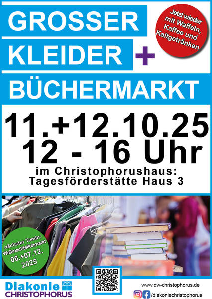 Am 11. und 12.10.2025 findet unser großer Kleider- und Büchermarkt am 11. + 12.10.2025 von 12:00-16:00 Uhr statt.